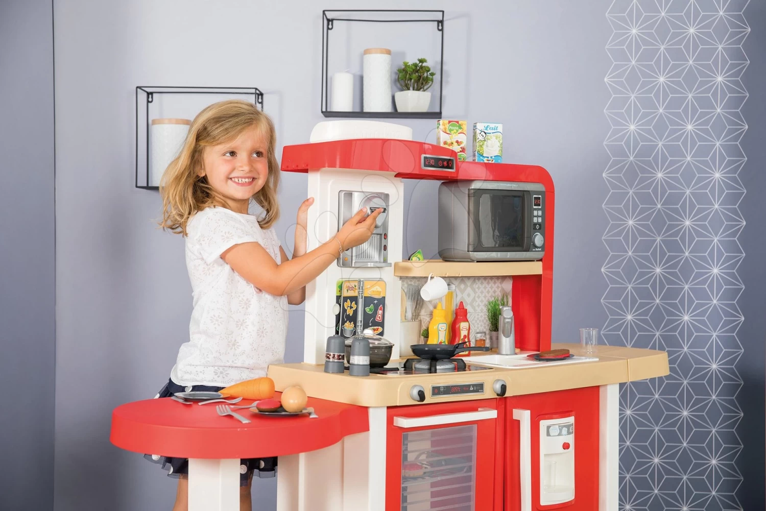 Küche Erweitbar Mit Fließendem Wasser Und Mikrowelle Tefal Evolutive Gourment Smoby Zwei Tische Und Ein Wagen Mit Burgern